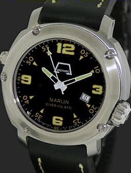 Anonimo Firenze Opera Meccana Marlin Diver watch. Limited Edition of 299 pieces. Sellita SW200 based automatic movement. Sandblasted finish single sealed massive super-diver 1500 meters pressureproof stainless steel case with helium escape valve. Black wave guilloche textured dial with date. Black leather heavy duty diver Kodiak strap.