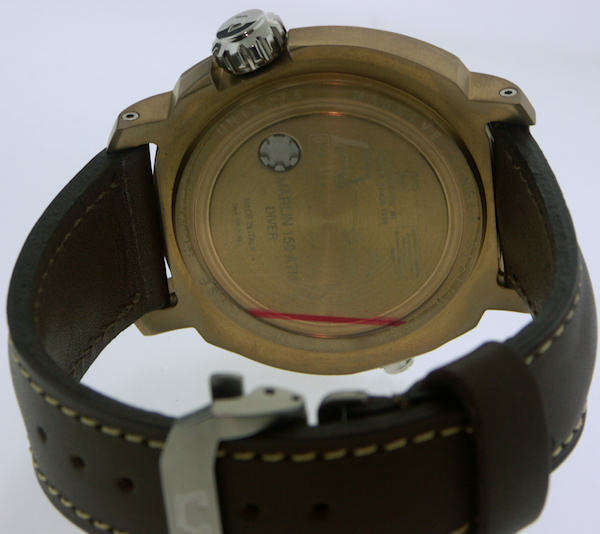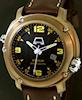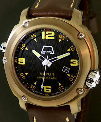 Anonimo Firenze Opera Meccana Marlin Diver watch. Limited Edition of 299 pieces. Sellita SW200 based automatic movement. Sandblasted finish single sealed massive super-diver 1500 meters pressureproof bronze case with helium escape valve. Black wave guilloche textured dial with date. Brown leather heavy duty diver Kodiak strap.