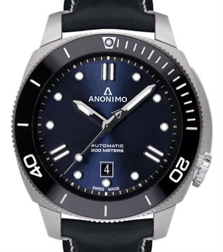 Anonimo Nautilo Automatic model AM-1002.09.006.A03 powered by Sellita SW200-1 self-winding mechanical movement. Stainless steel case. Black rotating 0-60 bezel with ceramic insert. Navy blue dial with date calendar at 6 o`clock, Superluminova hands and markers. Navy blue leather band. 200 meters water resistant