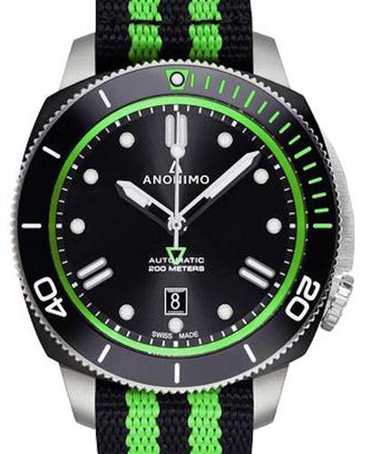 Anonimo Nautilo Leopard Racing model AM-1002.11.007/A16 powered by Sellita SW200-1 self-winding mechanical movement. Limited Edition of 97 pieces. Black DLC plated and steel case. Black bezel with green 0-15 sector. Black dial with green outer ring, date calendar, Superluminova hands and markers. Black and green NATO style strap. 200 meters water resistant