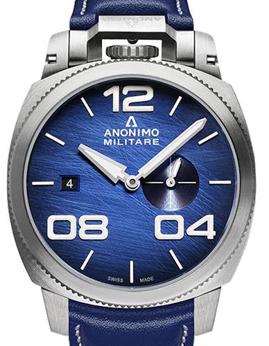 Anonimo Militare Automatic model with AM-1020.01.003.A03. Blue color scratched dial with large Arabic numerals, date calendar at 9 o`clock position and small second sub-dial at 3 o`clock position. Powered by Sellita SW260-1 self-winding mechanical movement. Stainless steel case with blue leather band, and sapphire crystal.