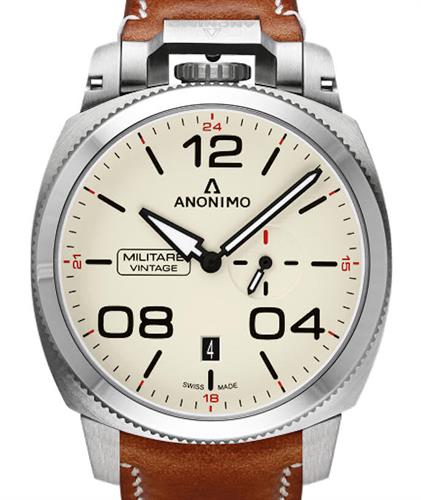 Anonimo Militare Automatic model with AM-1021.01.001.A02. Eggshell dial with large Arabic numerals, date calendar at 6 o`clock position and small second sub-dial at 3 o`clock position. Powered by Sellita SW260-1 self-winding mechanical movement. Stainless steel case with brown leather band, and sapphire crystal.