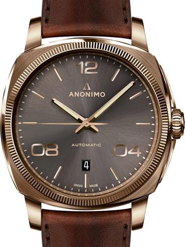Anonimo Epurato Automatic model with AM-4000.04.441.W88. Bronze case with sapphire crystal. Anthracite sunray dial with large Arabic numerals and date calendar at 6 o`clock position. Powered by Sellita SW200 self-winding mechanical movement. Brown leather band.