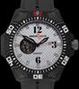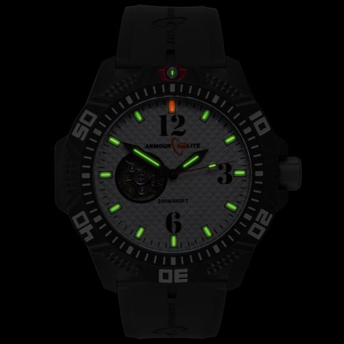 Caliber collection, AL1212 "Black and White" model by ArmourLite with polycarbonate case, tritium illuminated green and orange markers and hands. Featuring Seiko NH38 Automatic movement, an anti-reflective scratch resistant sapphire crystal, unidirectional bezel, and 200m of water resistance. White textured dial with black Arabic numerals and "open heart" reviling balance wheel at 9 o`clock. Comes on black rubber strap. Black case and band