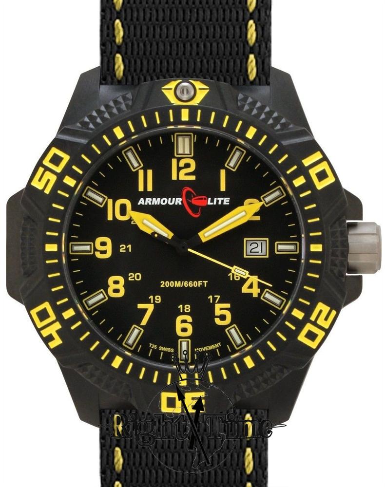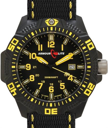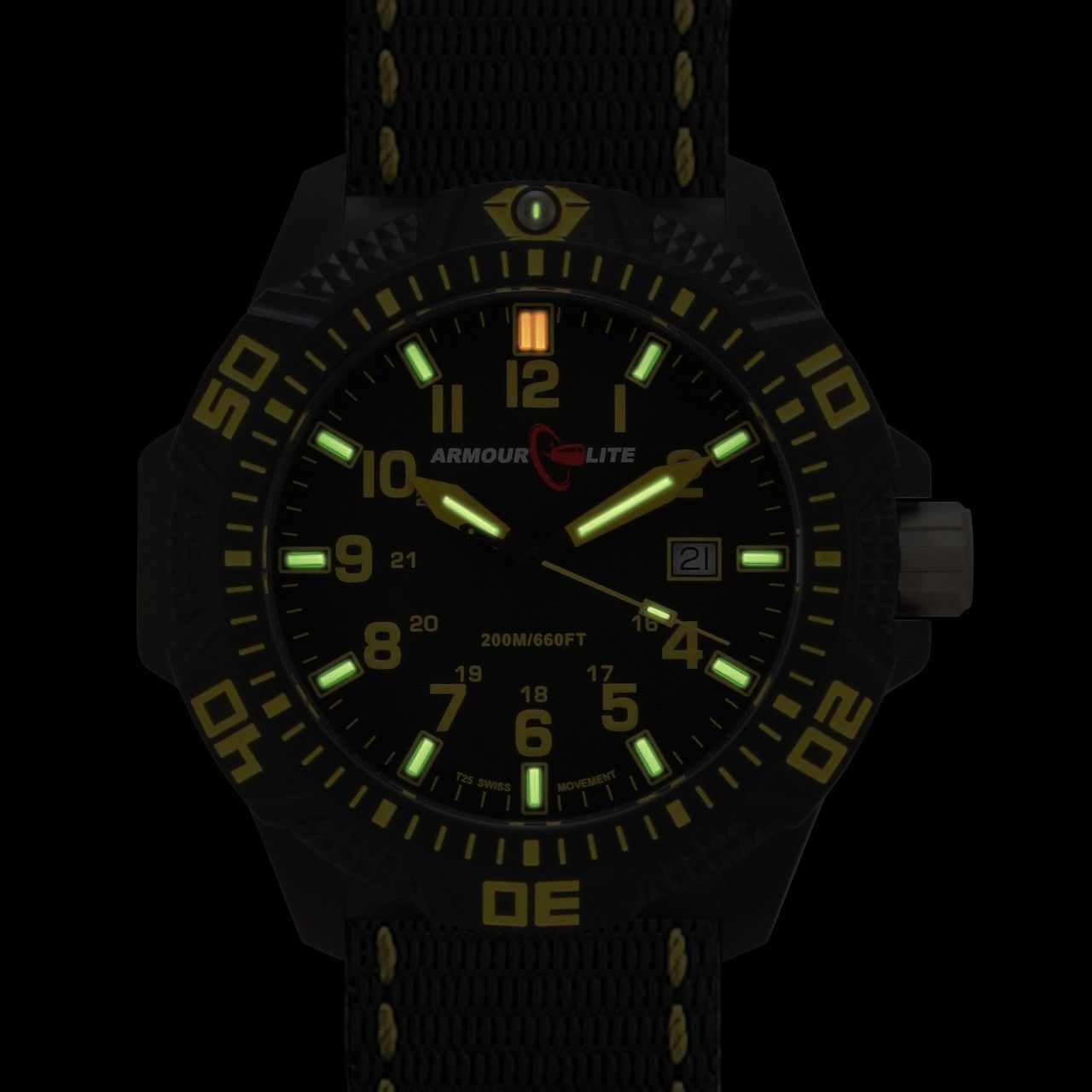 Caliber collection, AL604 "Black and Yellow" model(green & orange tritium glow) by ArmourLite with polycarbonate case, T25 tritium illuminated markers and hands. Featuring Swiss Ronda 515 Quartz movement, an anti-reflective scratch resistant sapphire crystal, tritium marker on the unidirectional bezel, and 200m of water resistance. Comes on nylon NATO style strap. Black case, band and dial with yellow numerals.