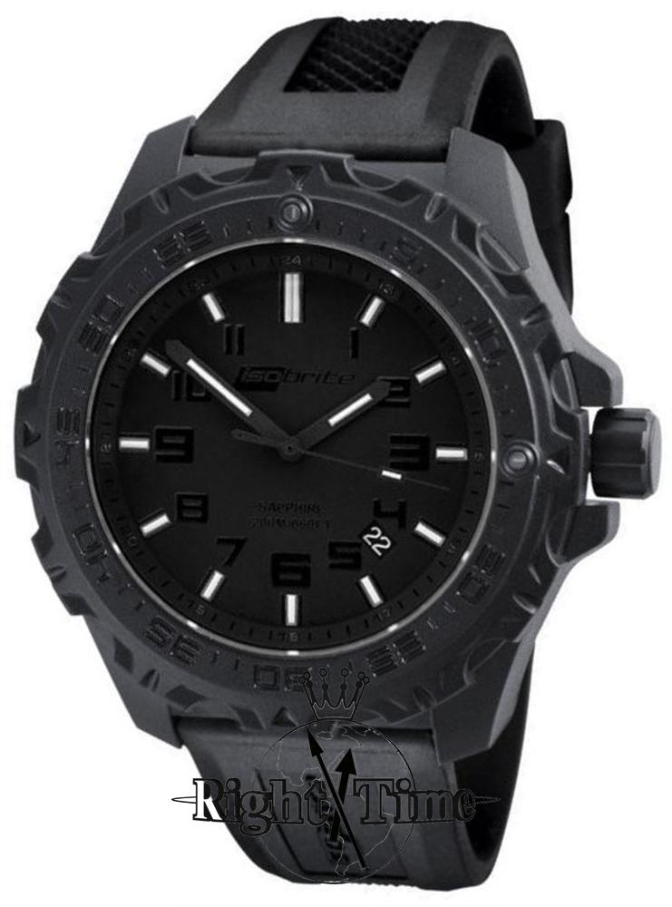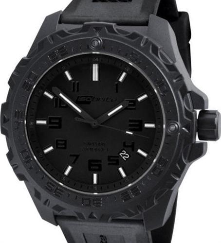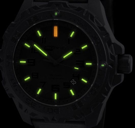Eclipse model ISO202 (green & orange tritium glow - the most visible color!) of the "Isobrite" collection by ArmourLite first poly case watch with T100 tritium illuminated markers and hands, inside ultra lightweight polycarbonate case. Featuring Swiss Ronda 715Li Quartz movement with a 10-year lithium battery, an anti-reflective scratch resistant sapphire crystal, two tritium markers on the unidirectional bezel, and 200m of water resistance. Comes in nice presentation box with extra nylon NATO style strap. Black case, band, and dial with black numerals - or as its called "blackout".