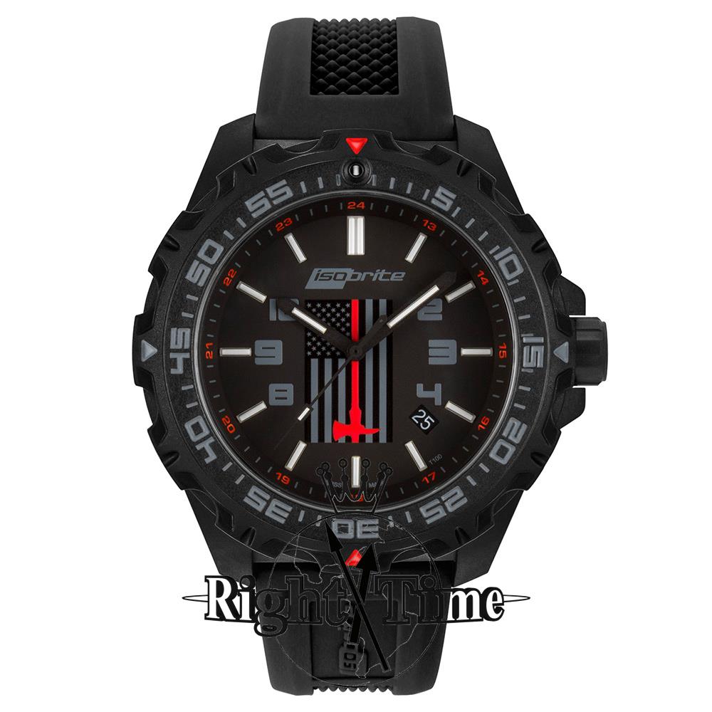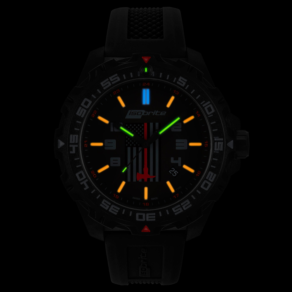 Firefighter RED ISO3009 (blue, green & orange tritium glow) model of the "Isobrite" collection by ArmourLite first poly case watch with T100 tritium illuminated markers and hands, inside ultra lightweight polycarbonate case. Featuring Swiss Ronda 715Li quartz movement with an anti-reflective scratch resistant sapphire crystal, tritium markers, and 200m of water resistance. Comes with extra nylon bands and a spring bar pin tool