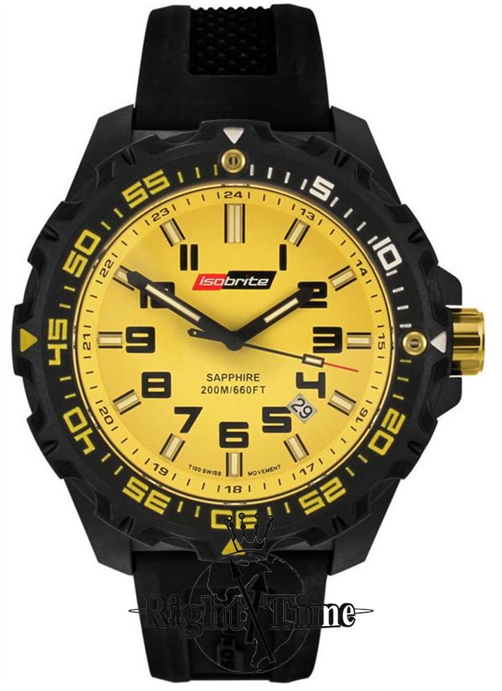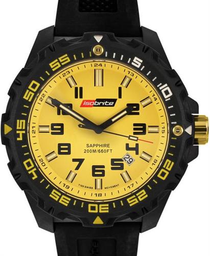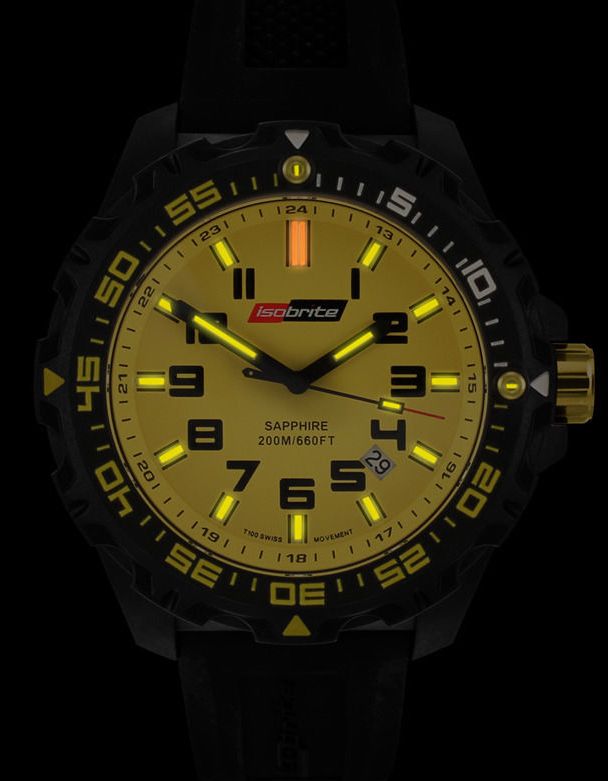 Valor model ISO303 (Yellow & Orange Tritium) of the "Isobrite" collection by ArmourLite first poly case watch with T100 tritium illuminated markers and hands, inside ultra lightweight polycarbonate case. Featuring Swiss Ronda 715Li Quartz movement with a 10-year lithium battery, an anti-reflective scratch resistant sapphire crystal, two tritium markers on the unidirectional bezel, and 200m of water resistance. Comes in nice presentation box with extra nylon NATO style strap. Black case and band with yellow dial, black numerals.