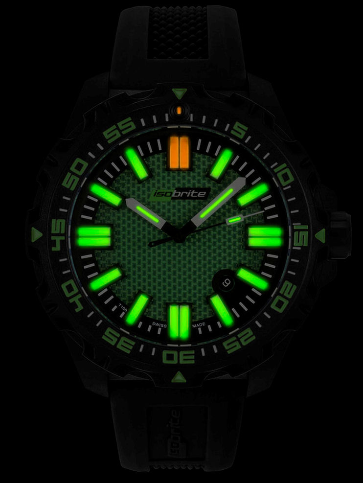 Isobrite Afterburner Series watches. Model ISO4002 Green. Inspired by the incredible power of the twin afterburners of the F-22 Raptor. This incredibly bright watch powered by T100 tritium reminds of lighted up night sky from F-22 afterburners exhaust flames.