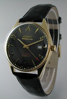 Black color. Sunburst Guilloche treatment. Applied polished gold tone markers.