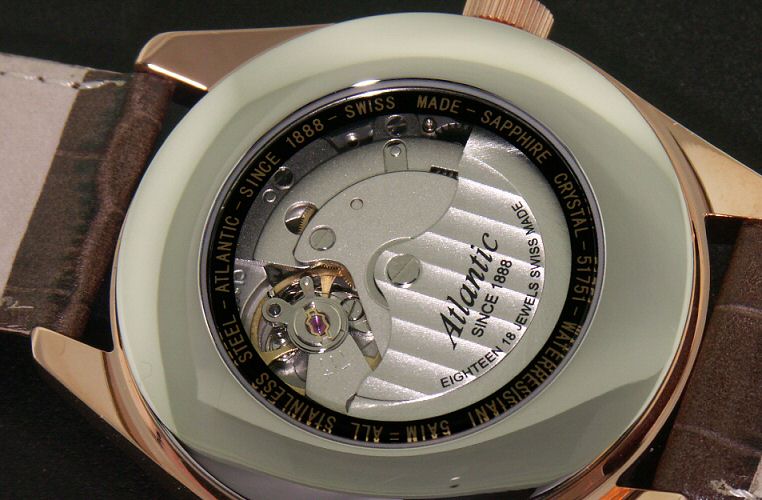New style with larger case size! Atlantic worldmaster Art deco wrist watch with Swiss made Claro 888 18 jewels Automatic movement, date calendar, stainless steel rose gold plated case, observation case back, sapphire crystal, leather band, rose gold color markers and slate Gray color dial with sunburst Guilloche treatment.