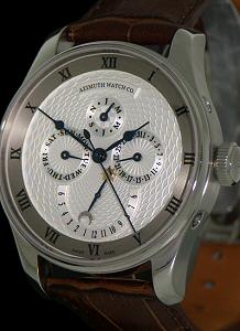 Azimuth Calendrier Round-1 Collection. Automatic ETA 2836-2 movement with triple date (day, date, month) calendar and day/night indicator. 316L stainless steel case with sapphire crystal, brown crocodile grained watch strap. Gorgeous silver color Guilloche dial with Roman numbers.