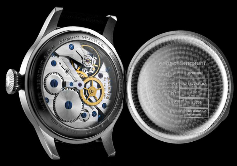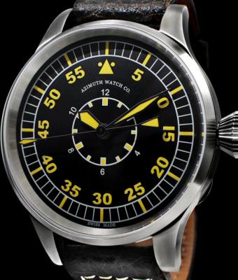 Manual wind Azimuth Militare Vintage B-UHR 48mm Inner Hour watch powered by modified Unitas 6497/8 movement with extra sweep second wheel, pinion and large second hand. Satin finished stainless steel case with hinged solid steel back cover revealing the beautifully finished unique movement.