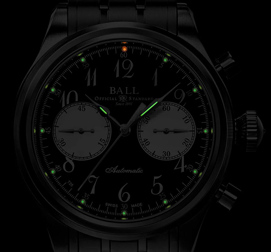 Ball Trainmaster Cannonball comes with the BALL RR1401 movement. This watch features a 60 second, 45 minute chronograph. Black dial with white sub-dials makes this a very classic look. 14 micro gas tubes and a sapphire crystal with a sapphire observation case back. 50 meters water resistant. Limited Edition of 1000 pieces.