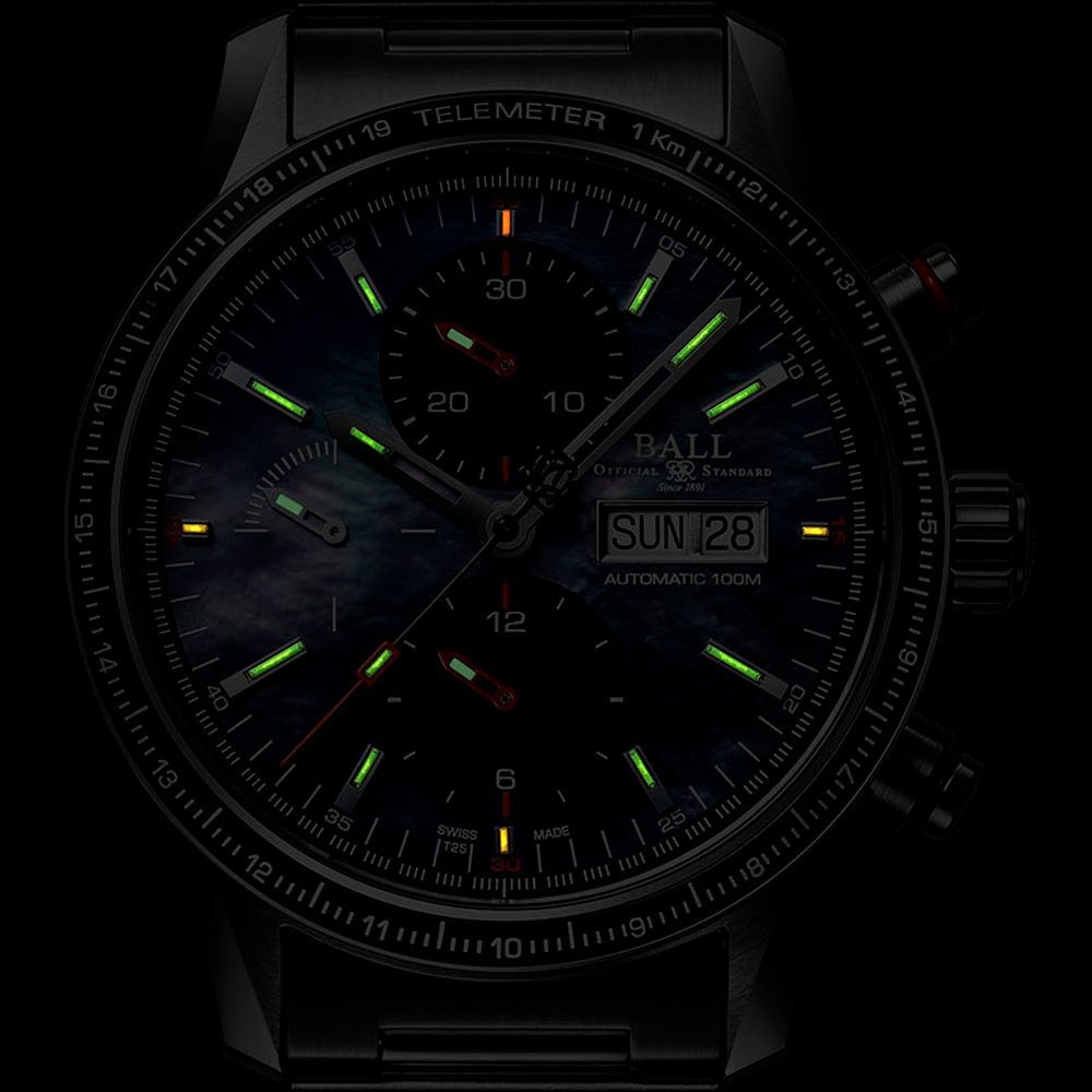 BALL Fireman Storm Chaser Pro watch with Swiss automatic BALL RR1402 chronograph movement with day and date calendar, stainless steel case, black bezel, sapphire crystal, micro gas tubes for night reading capability, blue Mother-of-Pearl dial with black sub-dials, and steel bracelet.