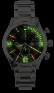 Inner rotating 60 minutes, operated by chronograph reset button. Illuminated with orange color accents. Operable under the water.