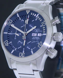 Limited Edition of only 500 pieces, BALL Engineer Master II Diver Chronograph watch powered by Valjoux/ETA 7750 automatic chronograph movement with day and date calendar. 330 feet water resistant. Stainless steel satin finished case and watch bracelet, sapphire crystal, inner turning 60 minutes bezel. Blue dial is signed by Guillaume Nery - world champion free diver.