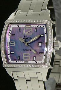 BALL Lady Conductor watch with blue color Mother-of-Pearl dial. Automatic ETA movement, stainless steel case with diamonds around bezel and on the case sides, sapphire crystal, micro gas tubes for night reading capability.
