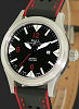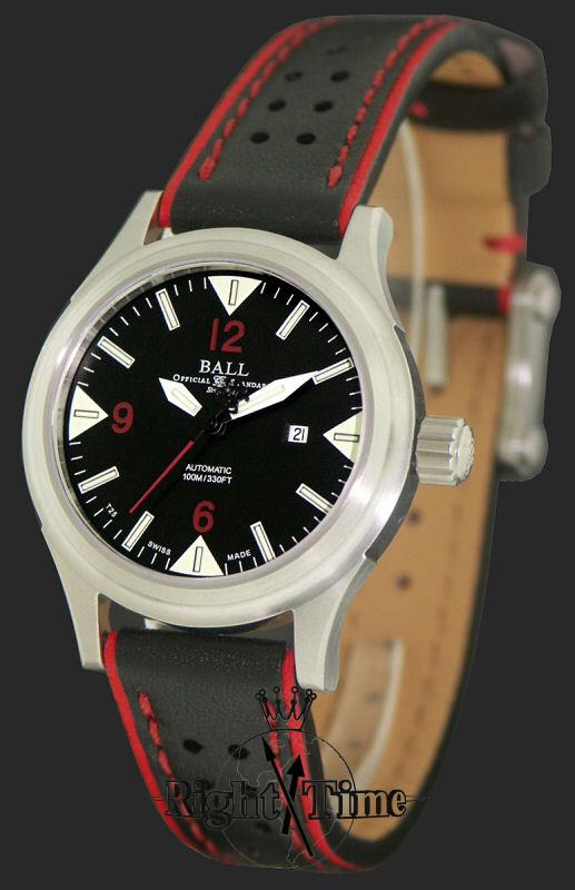 BALL Fireman II Lady watch with Swiss automatic ETA 2671 movement, stainless steel case, sapphire crystal, and micro gas tubes for night reading capability, black color dial with date calendar and red Arabic numerals, leather watch strap with red stitching.