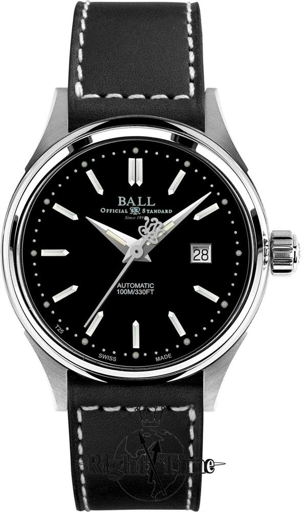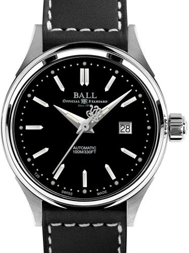 BALL Fireman Classic Lady watch with Swiss automatic ETA 2671 movement, 31mm stainless steel case, sapphire crystal, and micro gas tubes for night reading capability, black color dial with date calendar, black leather band.
