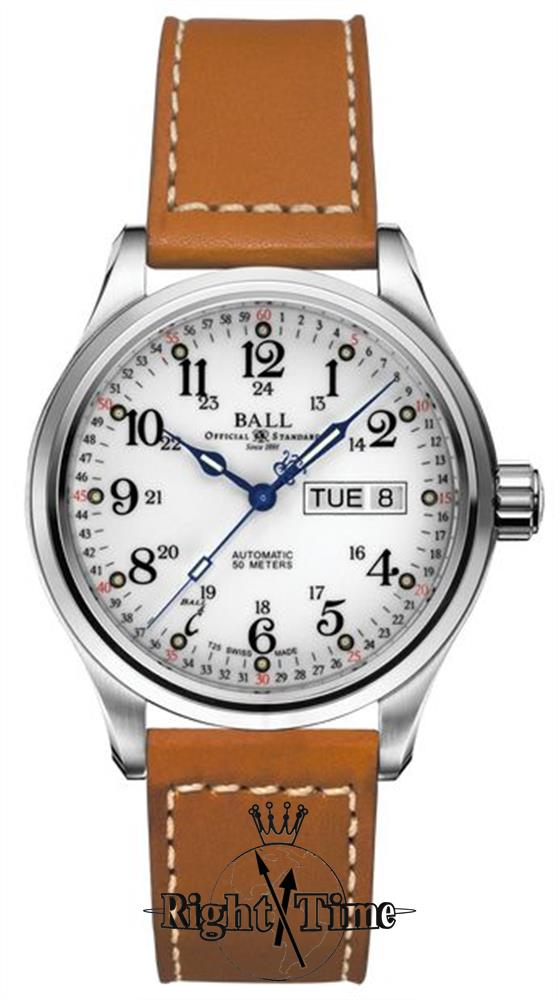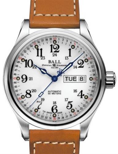 BALL Trainmaster "60 Seconds" dial gradation model NM1058D-L3J-WH powered by an automatic calibre ETA 2836-2 decorated Swiss made movement. Stainless steel case with brown leather band, sapphire crystal, micro gas tubes for night reading capability on white color dial with day/date calendar.