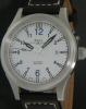 BALL Fireman 40mm watch with automatic ETA movement, stainless steel case, sapphire crystal, micro gas tubes for night reading capability, blue color markers on silver "pie pan" style dial, brown leather band.