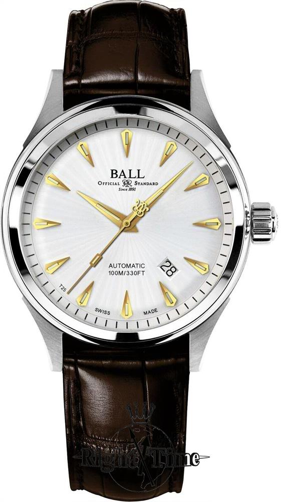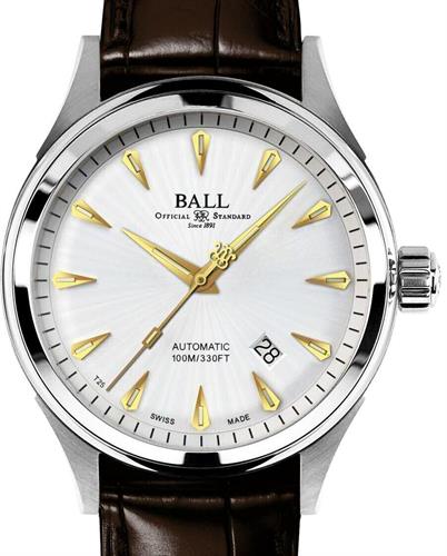 BALL Fireman "Racer Classic" 42mm NM2288C-LJ-SL watch with Swiss automatic ETA 2824-2 movement, stainless steel case with brown crocodile leather strap, flat sapphire crystal, and micro gas tubes for night reading capability, silver color dial with date calendar at 4:30 o`clock and yellow gold tone markers.
