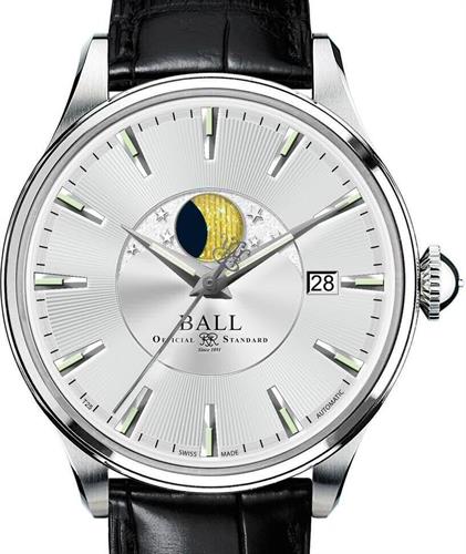 Ball Trainmaster Moon Phase. Model NM3082D-LLFJ-SL features 40mm case. Silver color dial. Sapphire crystal. Observation sapphire back. Black crocodile leather band.