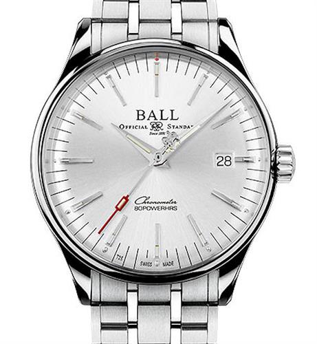 Ball Trainmaster series model NM3280D. In-house Ball manufacture calibre RRM7309-C automatic movement, with COSC certification, date function, and 80 hour power reserve. Polished 40mm stainless steel case with combination finish bracelet. Under the domed sapphire crystal sits a silver dial with tritium filled polished markers and hands.