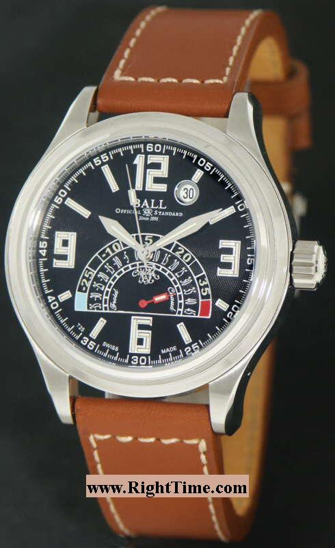 BALL Trainmaster TMT watch with automatic movement, thermometric indicator, stainless steel case, sapphire crystal, and micro gas tubes for night reading capability.