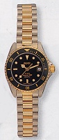 Belair A9406T-BLK stainless steel Lady diver wrist watch with gold plated accents from Belair Seapearl Pro-Diver Collection. Quartz movement, date calendar, black color dial with luminous hands and markers, uni-directional rotating 0-60 bezel, stainless steel watch band with gold plated accents and tri-fold clasp with security flip-lock. 200m water resistant.