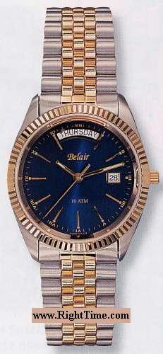 Belair stainless steel wrist watch with gold plated accents from Belair Executive Sport Collection. Quartz movement, day/date calendar, blue color dial, coin edge steel bezel, stainless steel band with gold plated accents and tri-fold clasp with security flip-lock. 100m water resistance
