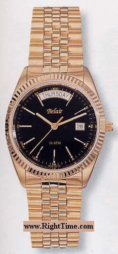 Belair gold plated stainless steel wrist watch from Belair Executive Sport Collection. Quartz movement, day/date calendar, black color dial, coin edge steel bezel, stainless steel gold plated watch band with tri-fold clasp and security flip-lock. 100m water resistance