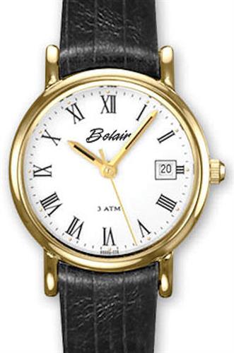 Belair gold plated stainless steel Ladies wrist watch from Belair Fashion Avenue Collection. Quartz movement with date calendar, ultra slim case, white color dial with Roman numerals and leather watch band.