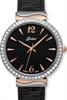 Belair ladies wrist watch. Swiss quartz movement, stainless steel case with rose gold tone accents, black dial, 54 Swarowski crystals on the bezel. Black leather straps.