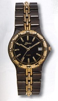 Belair stainless steel wrist watch with gold plated accents from Belair Executive Sport Collection. Quartz movement, date calendar, black PVD plated case, black color dial, Roman numerals on the bezel, black PVD plated stainless steel band with gold plated accents and deployant style clasp. 100m water resistance