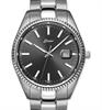 Belair stainless steel wrist watch from Belair Executive Sport Collection. Quartz movement, date calendar, grey color dial, coin edge steel bezel, stainless steel watch band with tri-fold clasp and security flip-lock. 100m water resistance