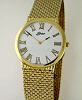 Belair stainless steel Men`s wrist watch from Belair Cosmopolitan Collection. Quartz movement, ultra slim gold plated case, white color dial with large Roman numerals, slim stainless steel gold plated watch bracelet with center opening deployment clasp and spring release.