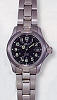 Belair stainless steel Lady diver wrist watch from Belair Seapearl Pro-Diver Collection. Swiss quartz movement, date calendar, black color dial with luminous hands and Arabic numerals, stainless steel watch band with tri-fold clasp and security flip-lock. 200m water resistant.