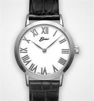 Belair Ladies 30mm case size wrist watch model A4420W/S-WHT. Quartz movement, steel round case, white color dial with Roman numerals. On black leather.