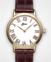 Belair Ladies 30mm case size wrist watch model A4420Y/S-WHT. Quartz movement, gold plated steel round case, white color dial with Roman numerals. On black or brown leather.