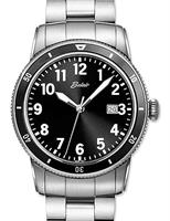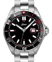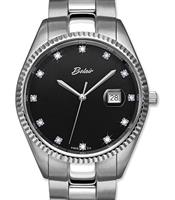 Belair stainless steel wrist watch from Belair Executive Sport Collection. Quartz movement, date calendar, black color dial with diamond markers, coin edge steel bezel, stainless steel watch band with tri-fold clasp and security flip-lock. 100m water resistance