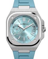 Bell & Ross BR-X5 Black Steel watch model BRX5R-IB-ST/SRB powered by Swiss automatic chronometer movement. Water resistant to 100 meters. Ice blue dial. Comes in a square stainless steel case on ice blue rubber band.