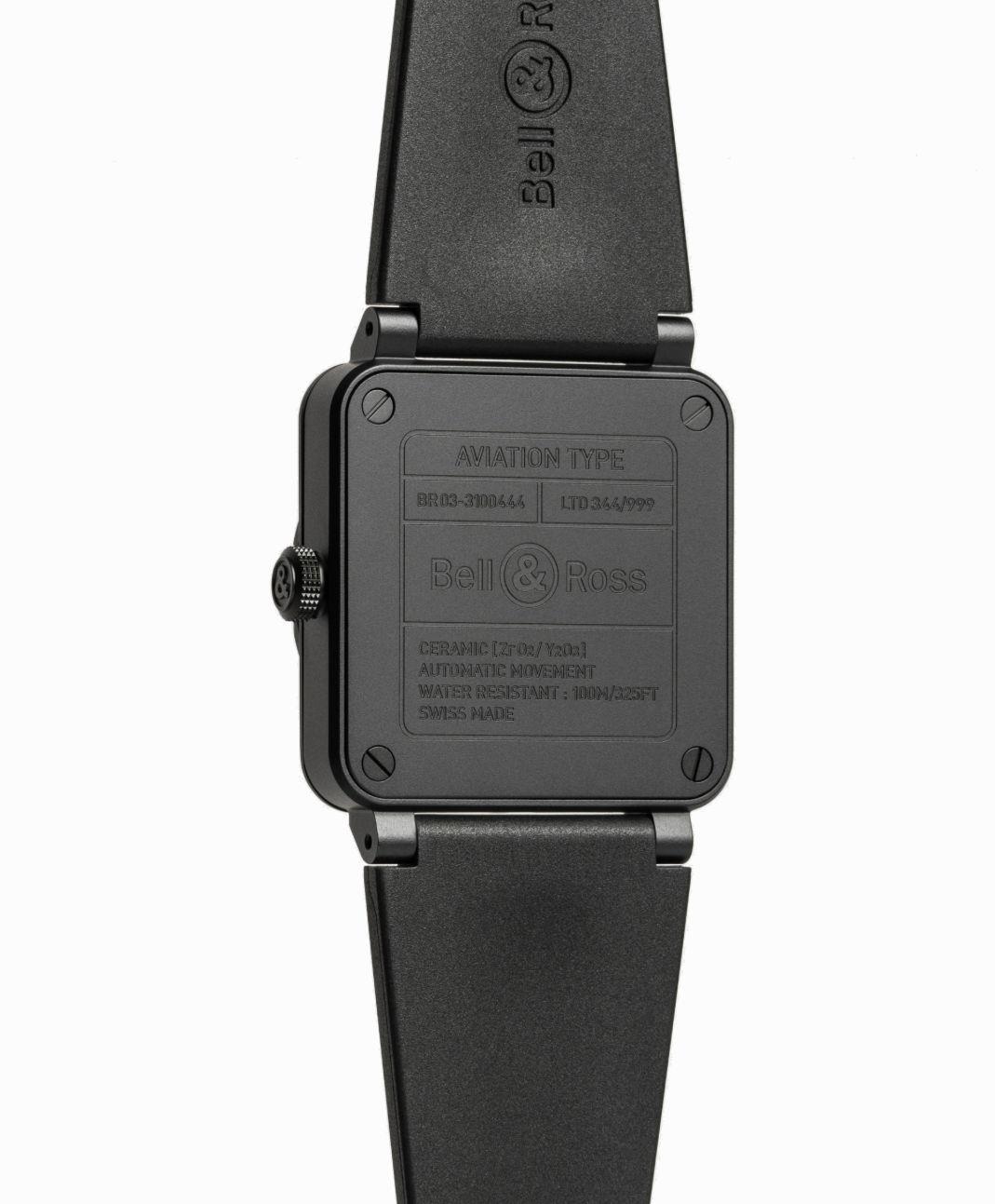 Bell & Ross BR 03 Gyrocompass watch model BR03A-CPS-CE/SRB powered by Swiss automatic movement. Limited Edition of 999 pieces. Water resistant to 100 meters. Black dial with luminous indexes. Comes in a square black ceramic case on a black rubber band.