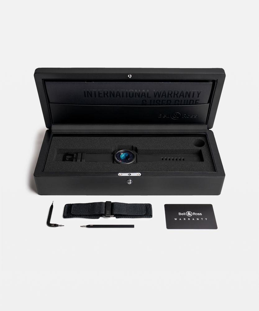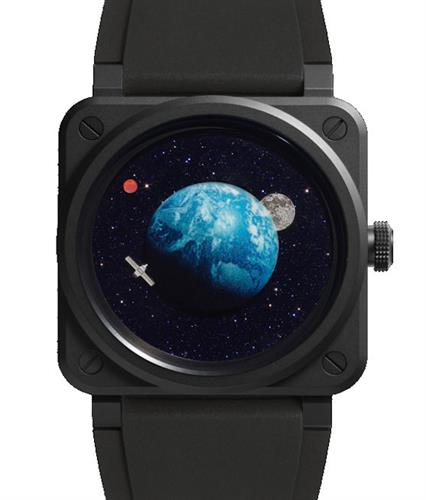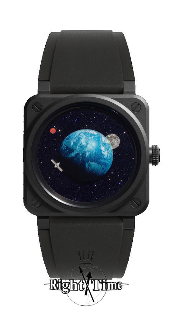 Bell & Ross BR 03 Astro Black Ceramic watch model BR03A-EMM-CE/SRB powered by Swiss automatic movement. Water resistant to 100 meters. Dial represents the cosmic universe: Earth is placed at its center and surrounded by the Moon and Mars. Comes in a square black ceramic case on a black rubber band.