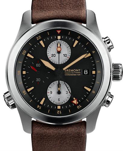 ALT1 Collection. Model ALT1-ZT-51-R-S powered by automatic chronograph movement. Stainless steel case with observation back. Black dial with 24-hours second time-zone hand and white sub-dials. Sapphire crystal. Brown leather band. Water resistant to 100 meters