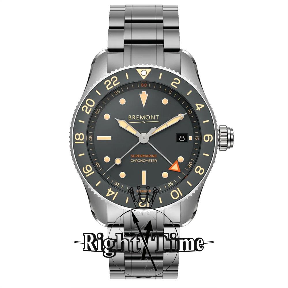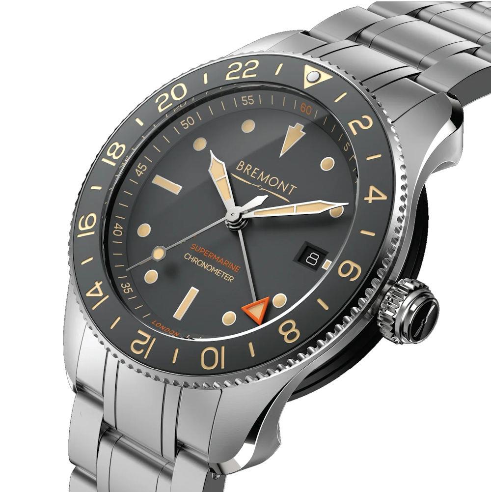 Bremont Supermarine Ocean Diver Collection. Model S302-GR-B. Limited Edition of 400 pieces. Powered by automatic movement. Stainless steel case with decorated back. Grey dial with date calendar, second time zone indicator, luminous hands and indexes. 24-hours rotating bezel. Sapphire crystal. Stainless steel bracelet. Water resistant to 300 meters