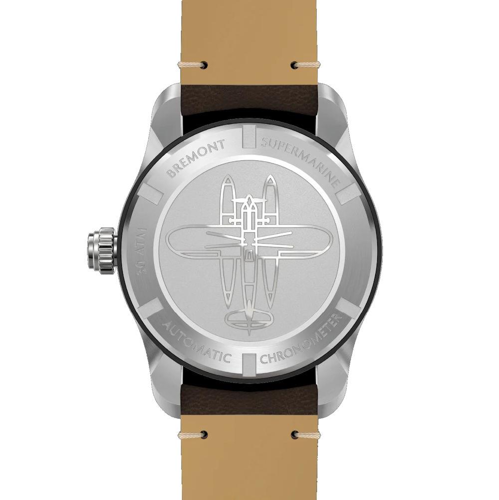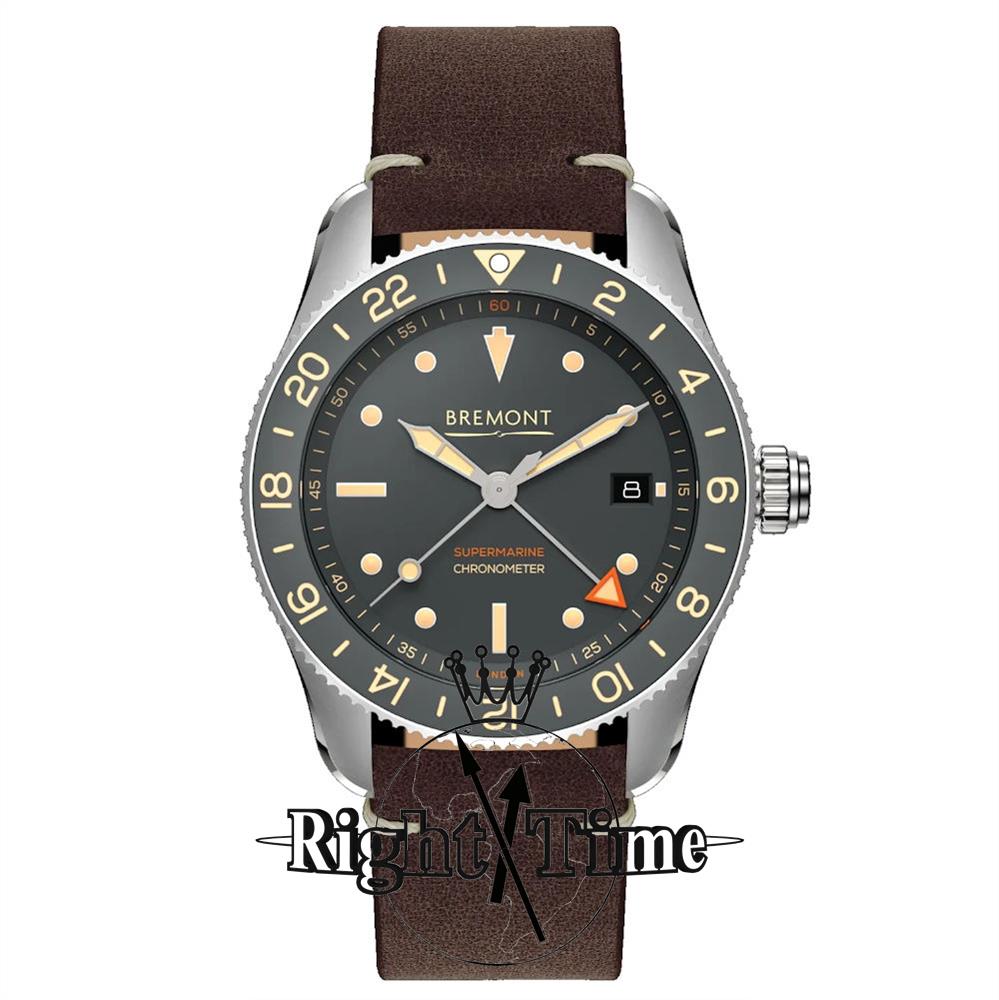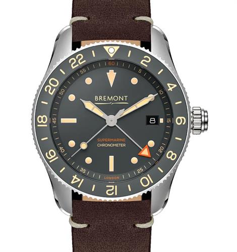 Bremont Supermarine Ocean Diver Collection. Model S302-GR-L-S. Limited Edition of 400 pieces. Powered by automatic movement. Stainless steel case with decorated back. Grey dial with date calendar, second time zone indicator, luminous hands and indexes. 24-hours rotating bezel. Sapphire crystal. Brown leather band. Water resistant to 300 meters