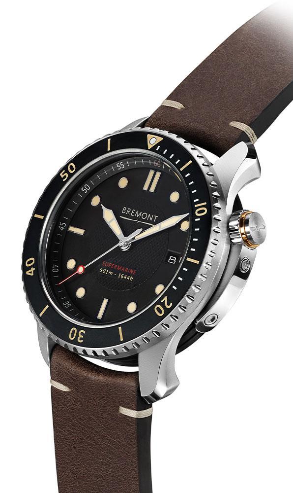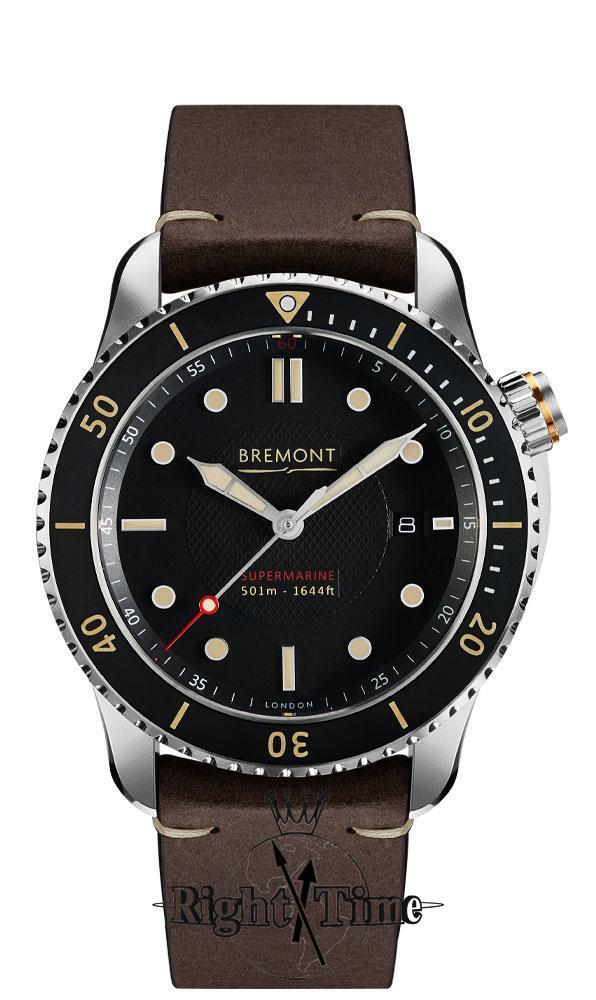 Bremont Supermarine Dive Collection. Model S501-BK-R-S powered by automatic movement. Stainless steel case with observation back. Black dial with date calendar, luminous hands and indexes. Black 0-60 rotating bezel. Sapphire crystal. Leather band. Water resistant to 500 meters