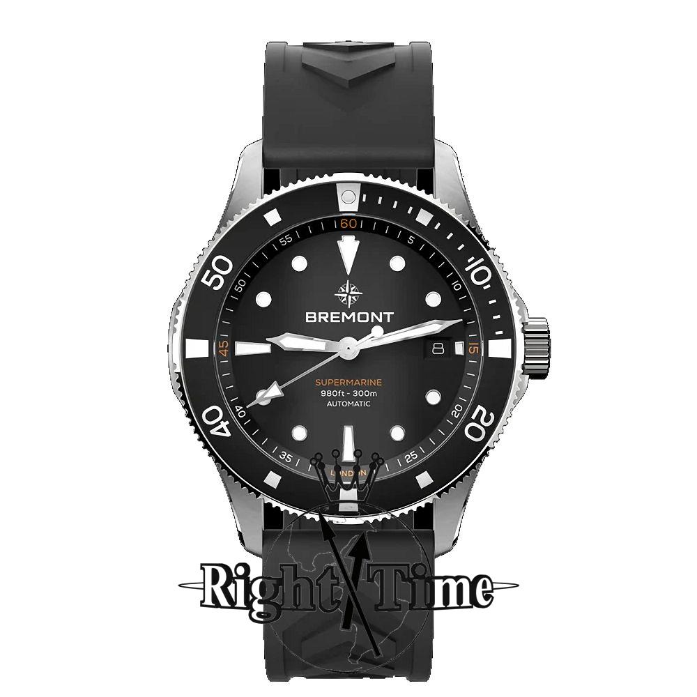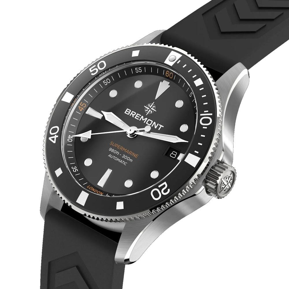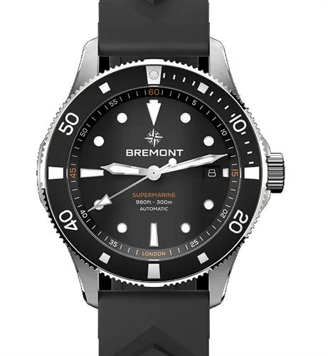 Bremont Supermarine Dive Collection. Model SM40-ND-SS-Bk-R-S powered by automatic movement. Stainless steel case with decorated back. Black dial luminous hands and indexes. Black 0-60 rotating bezel. Sapphire crystal. Black rubber band. Water resistant to 300 meters